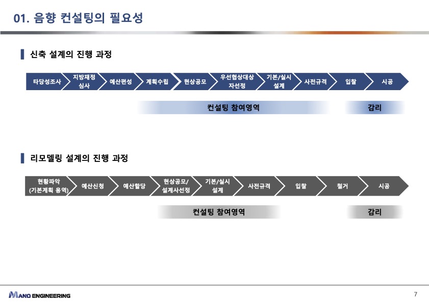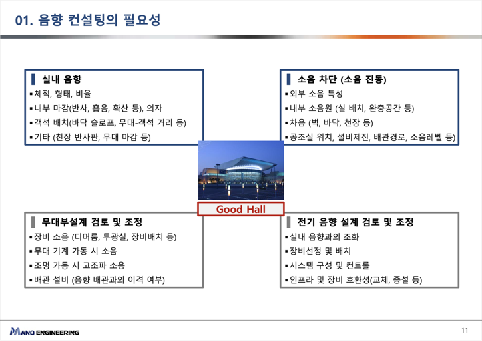 컨설팅을 통한 기본 계획 수립에서부터 구체적인 설계 단계, 그리고 입찰에 이르는 전 과정은 현재의 환경에서 많은 노력과 전문적인 지식이 요구됩니다. 이러한 복잡한 과정 속에서 운영자가 추구하는 공간을 완성하기란 쉽지 않습니다. 그래서 저희는 컨설팅 설계사라는 전문적인 인력과 체계를 통해 보다 효율적이고 만족도 높은 음향 공간을 만들어갈 수 있다는 점을 알리고 싶었습니다.