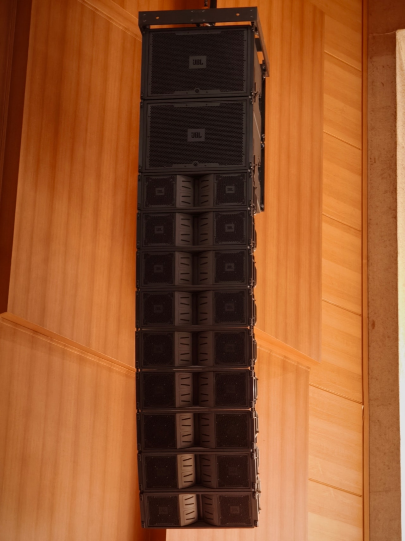 극장의 라인어레이 메인 스피커 JBL VT4886과 서브 우퍼 JBL VT4883.