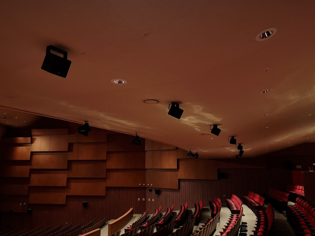 또 다른 큰 과제는 객석 구조였습니다. 초기에는 언더 발코니 스피커가 설치되어 있지 않았고, 기존 메인 스피커도 발코니 구조와 객석 형태상 2층까지 직접음을 충분히 전달하기 어려웠습니다. 특히 발코니 두께가 두껍고 높이는 낮으며, 2층 객석은 유리 난간 구조를 갖추고 있어, 메인 스피커만으로는 커버리지를 확보하기 힘든 환경이었습니다. 메인 스피커에서 오는 직접음에만 의존하기보다, 언더 발코니와 2층 객석에 딜레이 스피커를 추가하여 해당 구역에서는 사실상의 메인 시스템처럼 운용하도록 리뉴얼했습니다. 덕분에 객석 전반의 음압과 명료도를 보다 균형 있게 확보할 수 있었습니다.
