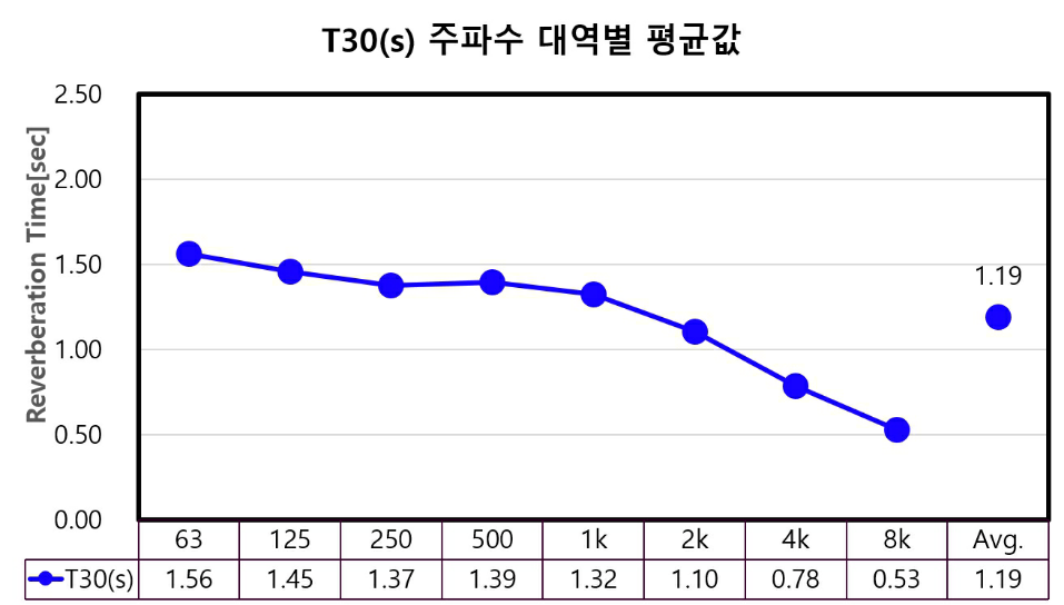 한편, 이번 측정은 음향 반사판을 설치하지 않은 상태에서 수행되어 잔향 시간이 상대적으로 짧게 나타난 것으로 판단된다. 일반적으로 음향 반사판을 설치할 경우 500Hz 기준 잔향시간이 약 0.3~0.4초 증가하는 점을 고려하면, 잔향감은 일정 수준 개선될 수 있다.
