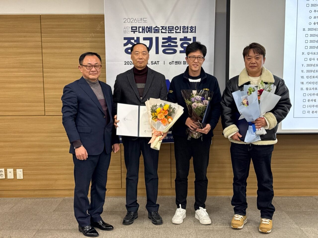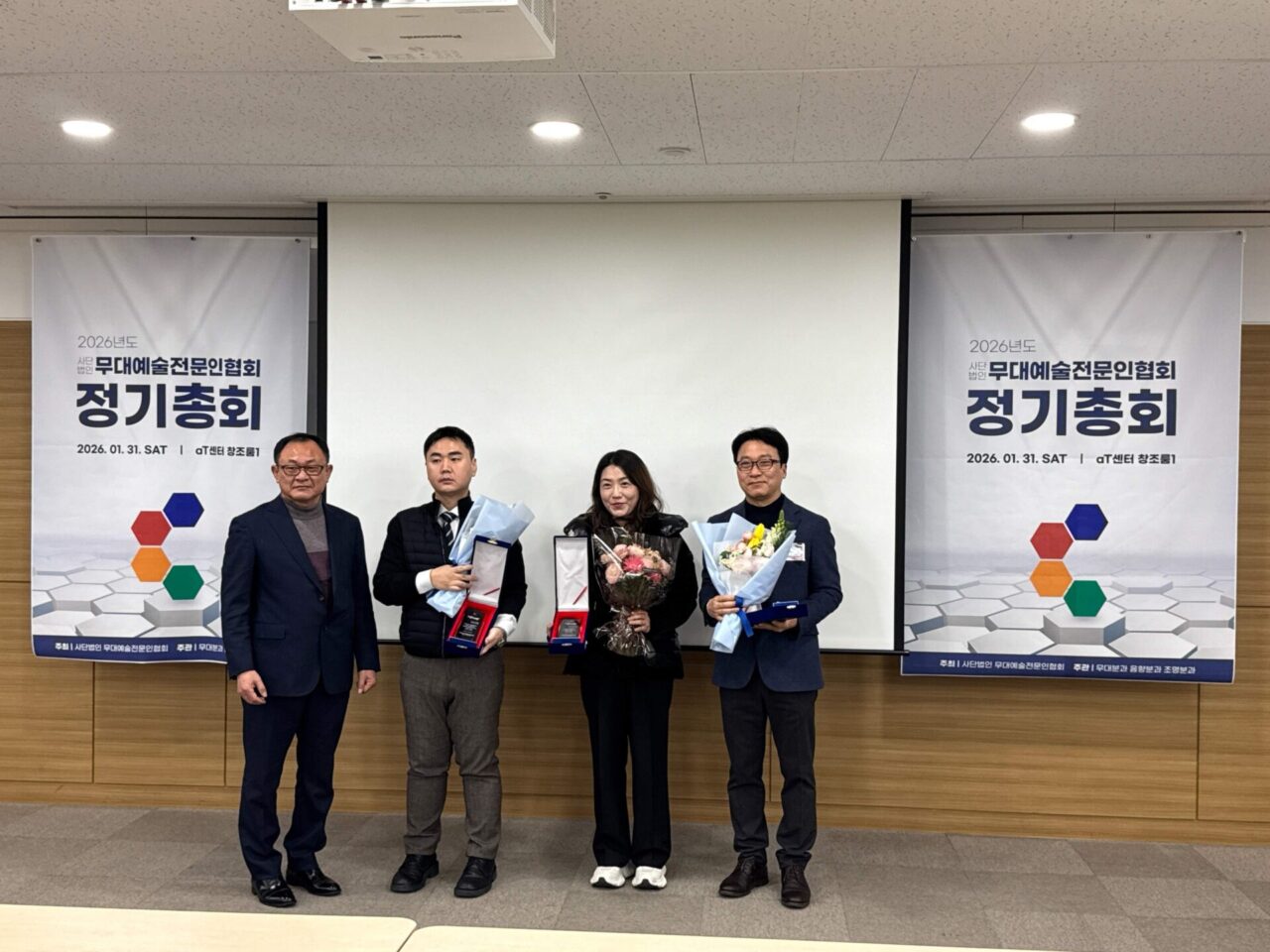 2026년 무대예술전문인 최우수 회원상 수상자. 좌측부터 창원문화재단 김희겸 회원(무대분과), 영화의전당 김병태 회원 (음향분과), 도봉구민회관 박남석 회원(조명분과)